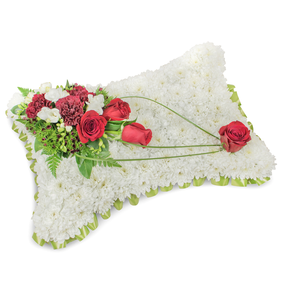 Express your deepest sympathies with our elegant bouquet, showcasing a beautiful balance of white chrysanthemums, red roses, white freesias, and dark red carnations. Enhanced with delicate dianthus and bear grass, this arrangement offers a unique and heartfelt tribute.